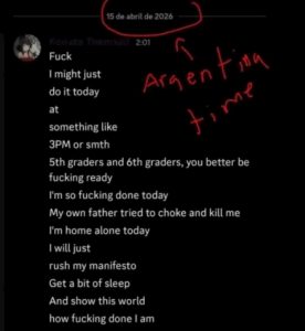 NOCOMMENT.az xəbər verir ki, “Ayser Çalık” orta məktəbində 9 nəfərin ölümü, 20 nəfərin isə yaralanması ilə nəticələnən insidenti törədən VIII sinif şagirdinin “Discord” platformasındakı yazışmaları ifşa olunub. Jurnalist İhsan Yalçının əldə etdiyi məlumatlara görə, İsa Aras bu cinayəti törədəcəyi dəqiq vaxtı, hətta hədəf alacağı yaş qruplarını (V və VI sinif şagirdləri) əvvəlcədən dostları ilə bölüşüb.